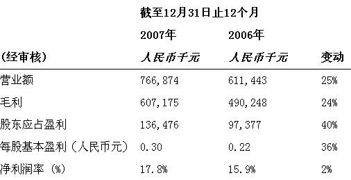 金蝶國(guó)際于回顧期年度內(nèi)的營(yíng)業(yè)額為約人民幣766,874,000元,較2006年增加約25%(2006年:人民幣611,443,000元)。毛利增至約人民幣607,175,000元,增幅約24%(2006年:人民幣490,248,000元) 。權(quán)益持有人應(yīng)占盈利為人民幣136,476,000元,較2006年上升約40%(2006年:人民幣97,377,000元)。利潤(rùn)率比2006年同期上升2個(gè)百分點(diǎn),達(dá)到17.8%。每股基本盈利為人民幣0.30元(2006年:人民幣0.22元)。董事會(huì)建議派發(fā)未期股息每股0.085港元(2006年:0.065港元)。