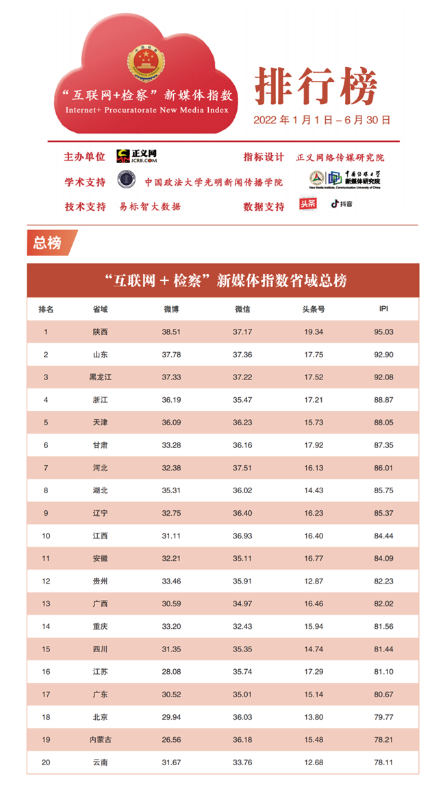 8月3日,2022年上半年“互聯(lián)網+檢察”新媒體指數排行榜發(fā)布。該榜單評選由正義網主辦,中國政法大學光明新聞傳播學院、中國傳媒大學新媒體研究院提供學術支持,正義網絡傳媒研究院設計指標體系。