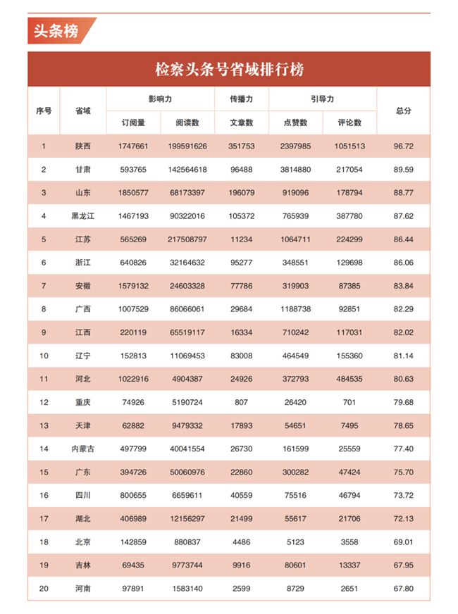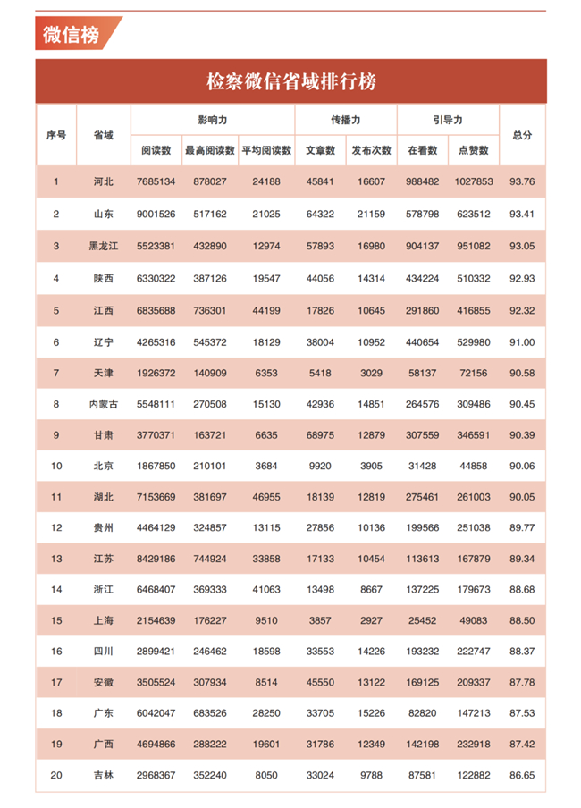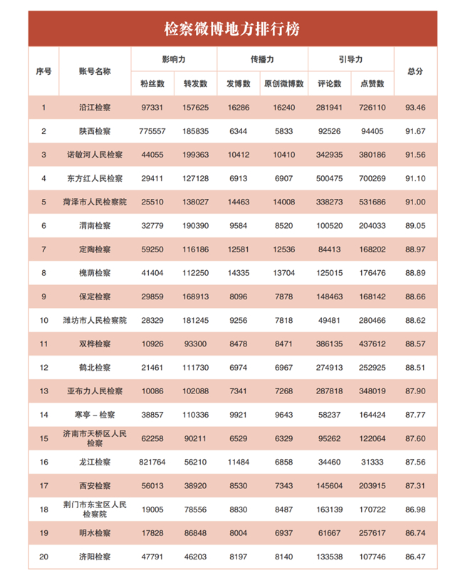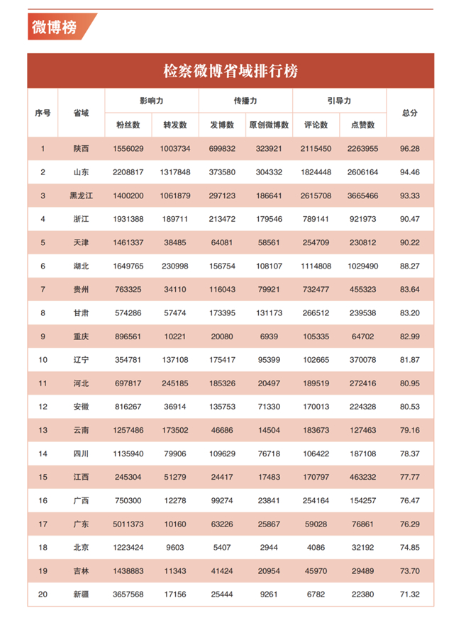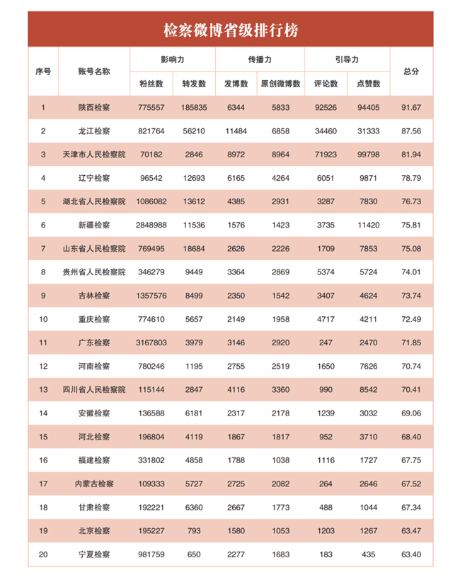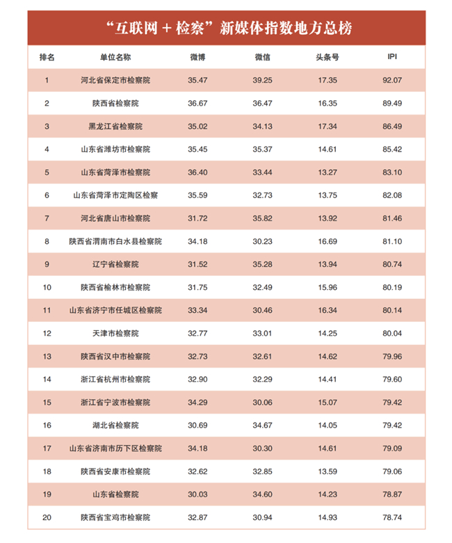 5. “互聯(lián)網+檢察”指數排行榜由省域榜和地方榜組成。其中,省域榜是以全國不同省級行政區(qū)域內新媒體各項基礎指標的總數和均值,按照30%、70%的權重運算得出。地方榜則是以每個檢察機關新媒體各項基礎指標加權運算得出。