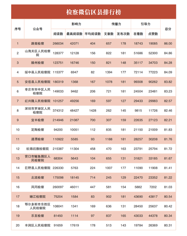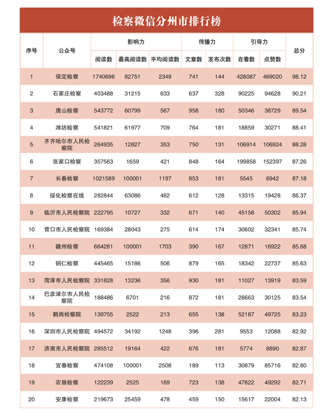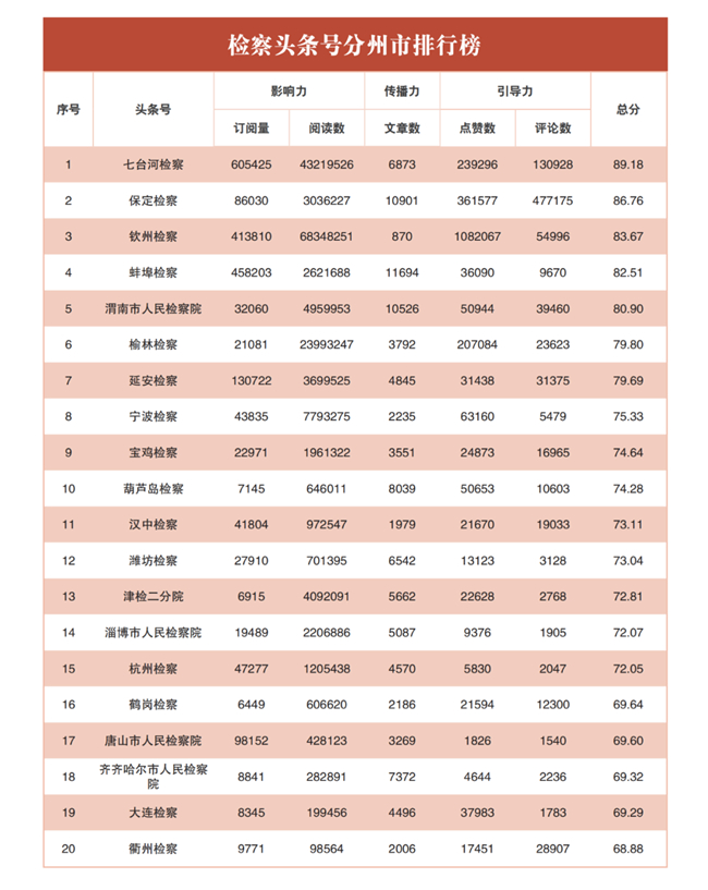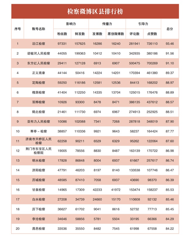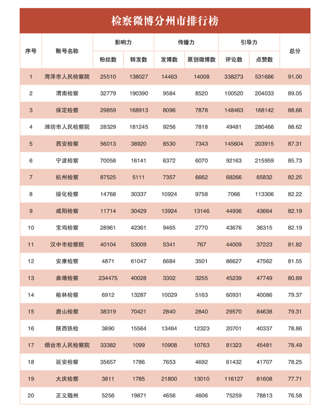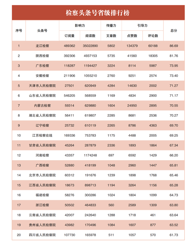 5. “互聯(lián)網+檢察”指數排行榜由省域榜和地方榜組成。其中,省域榜是以全國不同省級行政區(qū)域內新媒體各項基礎指標的總數和均值,按照30%、70%的權重運算得出。地方榜則是以每個檢察機關新媒體各項基礎指標加權運算得出。