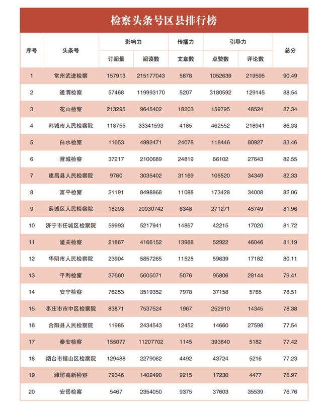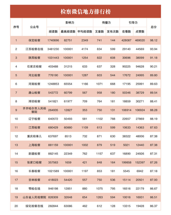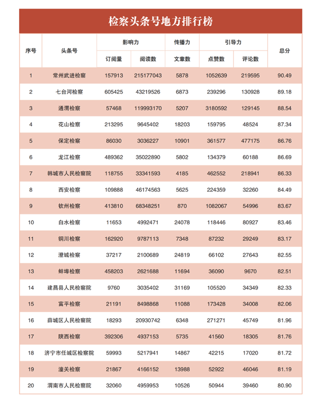 地方榜中,河北省保定市檢察院、陜西省檢察院、黑龍江省檢察院位居總榜前三。黑龍江省沿江檢察院榮獲微博榜冠軍,河北省保定市檢察院位列微信榜首位,江蘇省常州市武進區(qū)檢察院位居頭條榜首位。地方微博榜中,陜西省檢察院、山東省菏澤市檢察院、黑龍江省沿江檢察院分別占據省級榜、分州市榜、區(qū)縣榜榜首。地方微信榜中,江蘇省檢察院、河北省保定市檢察院、河北省唐山市路南區(qū)檢察院分別位居三級榜首位。地方頭條榜中,黑龍江省檢察院、黑龍江省七臺河市檢察院、江蘇省常州市武進區(qū)檢察院分別奪得三級榜冠軍。地方抖音榜中,廣東省潮州市潮安區(qū)檢察院、江西省贛州市南康區(qū)檢察院、山東省棗莊市市中區(qū)檢察院躋身前三。