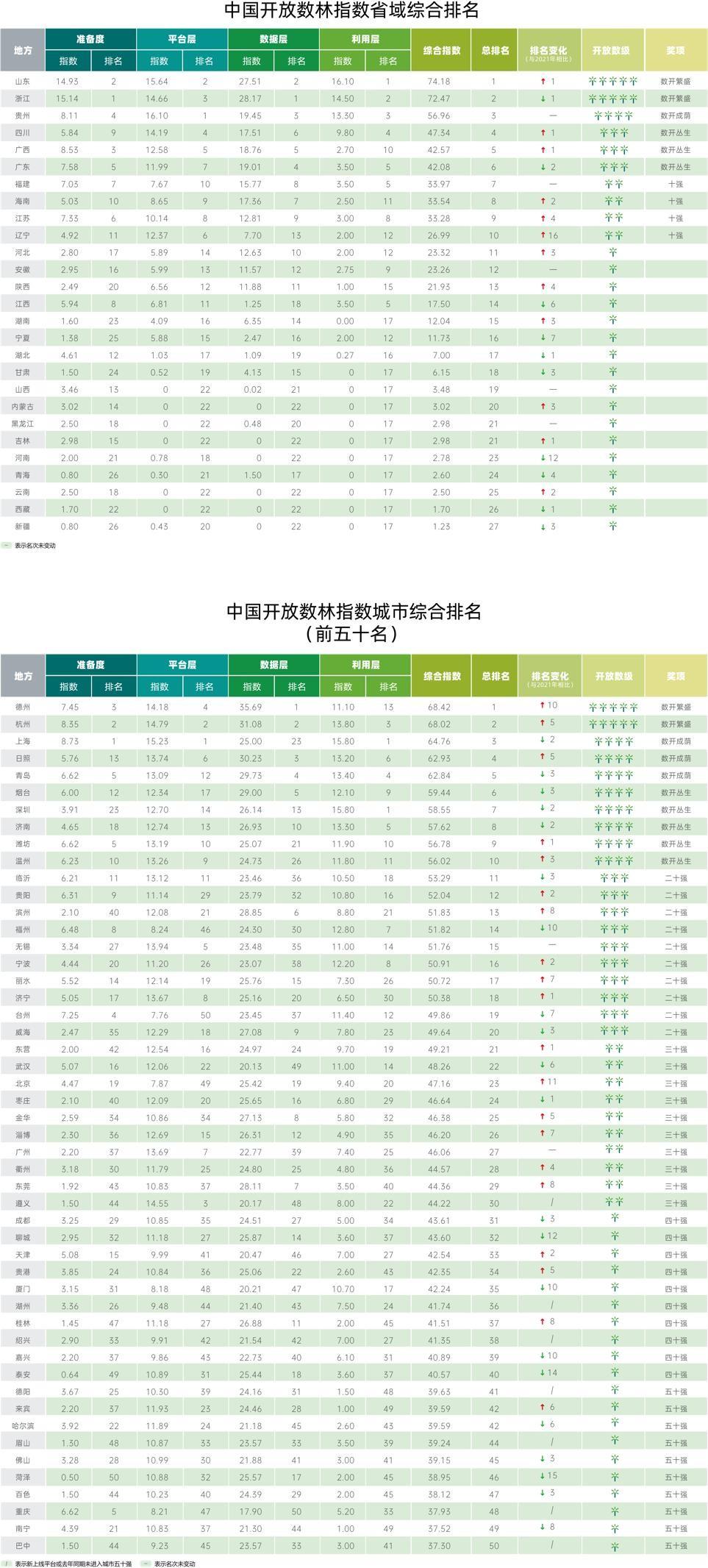 報(bào)告展示了2022年度全國(guó)省域開(kāi)放數(shù)林的指數(shù)分值、排名和等級(jí)。山東省和浙江省的綜合表現(xiàn)最優(yōu),獲得省域“數(shù)開(kāi)繁盛”大獎(jiǎng);貴州省也總體表現(xiàn)優(yōu)秀,獲得省域“數(shù)開(kāi)成蔭”獎(jiǎng)。在四個(gè)單項(xiàng)維度上,山東省在利用層位列第一,浙江省在準(zhǔn)備度和數(shù)據(jù)層位列第一,貴州省在平臺(tái)層位列第一。