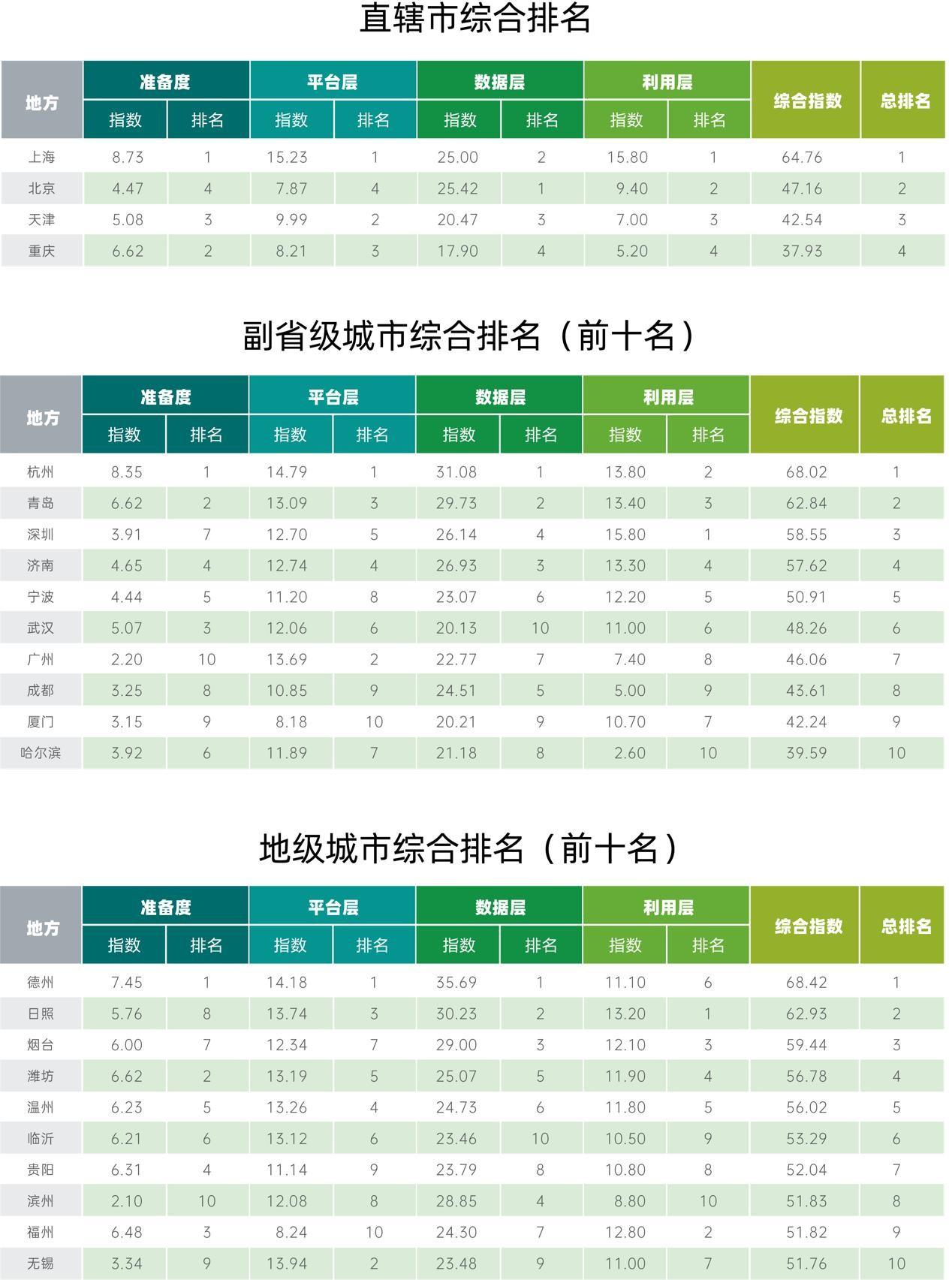 副省級(jí)開(kāi)放數(shù)林指數(shù)排名前十的地方如下表所示,杭州市綜合表現(xiàn)最優(yōu),位列第一,青島市和深圳市也表現(xiàn)優(yōu)異。