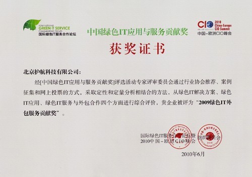 護(hù)航科技榮獲“2009綠色I(xiàn)T外包服務(wù)貢獻(xiàn)獎(jiǎng)”證書(shū)