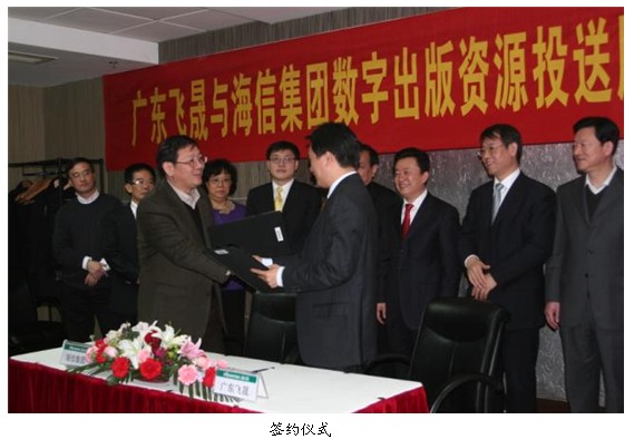 2010年12月28日,海信旗下傳媒網(wǎng)絡(luò)公司與廣東飛晟投資有限公司在青島海信大廈簽署戰(zhàn)略合作協(xié)議,就共同建設(shè)國家級數(shù)字出版平臺——廣東國家音樂創(chuàng)意產(chǎn)業(yè)基地,全面達成合作。國家新聞出版總署副署長孫壽山、海信集團總裁于淑珉,廣州開發(fā)區(qū)和省市領(lǐng)導等見證了簽約并表示祝賀。海信也借此正式進軍數(shù)字出版產(chǎn)業(yè)。