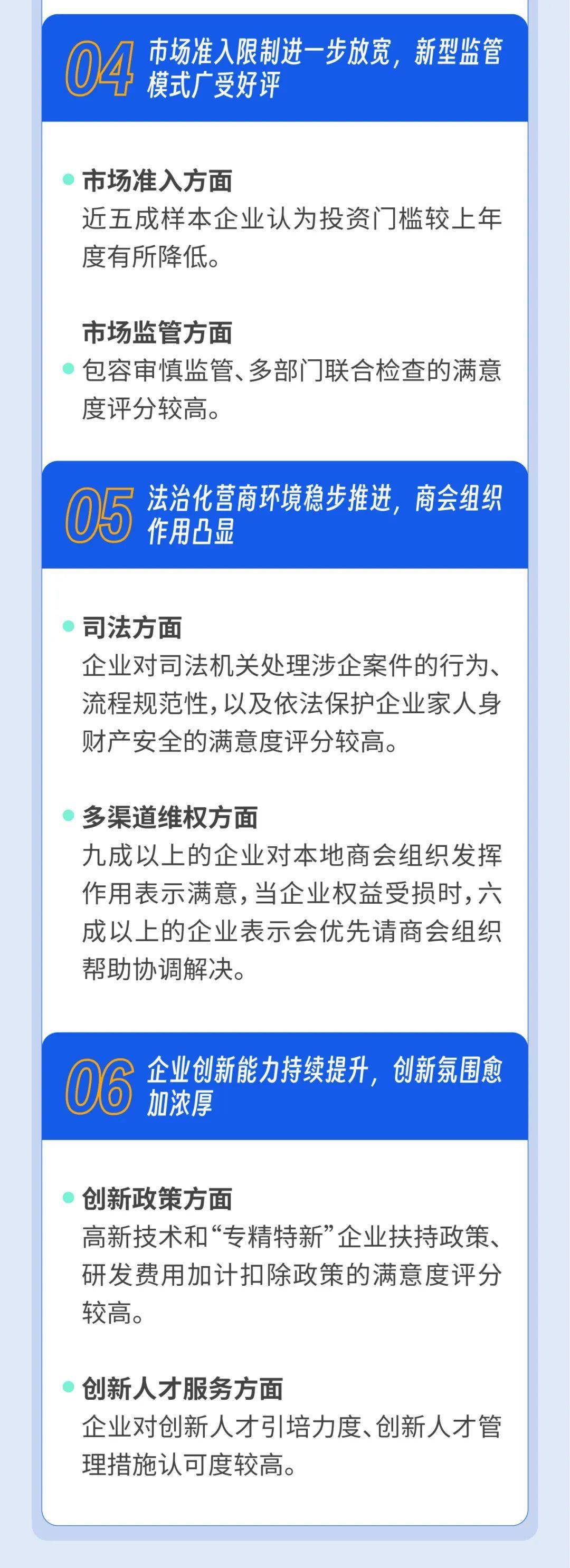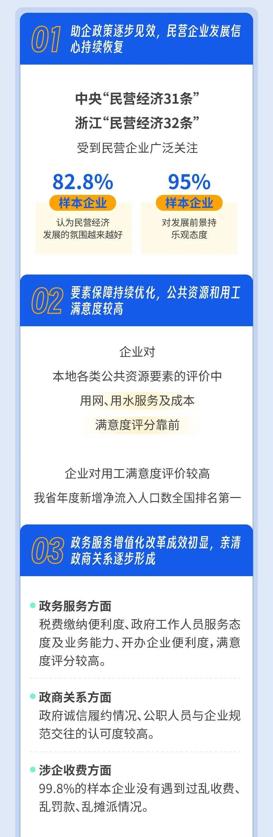 根據(jù)全國(guó)工商聯(lián)發(fā)布的2023年度“萬(wàn)家民營(yíng)企業(yè)評(píng)營(yíng)商環(huán)境”調(diào)查結(jié)果,我省營(yíng)商環(huán)境滿意度位列全國(guó)前十,獲評(píng)營(yíng)商環(huán)境最佳口碑省份,省工商聯(lián)開(kāi)展的萬(wàn)家民營(yíng)企業(yè)評(píng)營(yíng)商環(huán)境工作案例被評(píng)為全國(guó)十大優(yōu)秀實(shí)踐案例;杭州、寧波位列全國(guó)省會(huì)及副省級(jí)城市前十,并獲評(píng)營(yíng)商環(huán)境最佳口碑省會(huì)及副省級(jí)城市,溫州、嘉興、紹興、金華位列全國(guó)地級(jí)市前十,溫州、金華獲評(píng)營(yíng)商環(huán)境最佳口碑地級(jí)市。