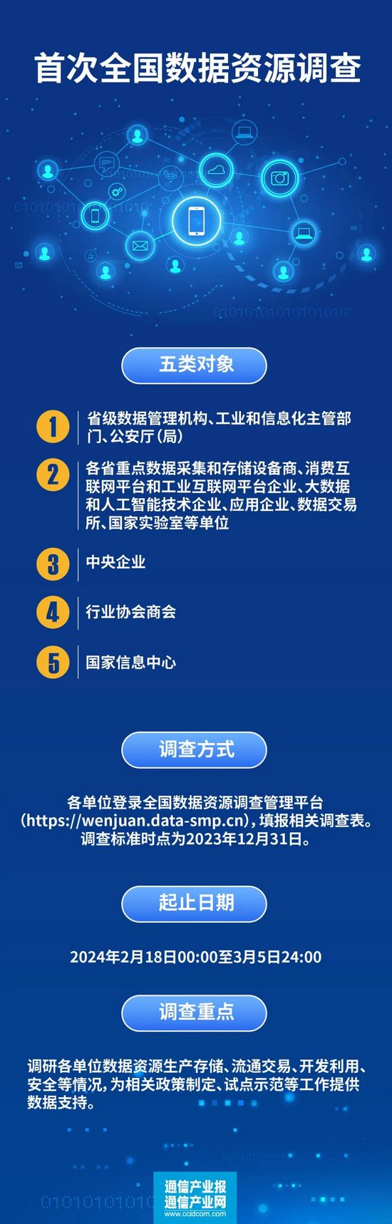 2月19日,國家數(shù)據(jù)局、中央網(wǎng)絡(luò)安全和信息化委員會辦公室、工業(yè)和信息化部、公安部聯(lián)合發(fā)出通知,為貫徹落實《數(shù)字中國建設(shè)整體布局規(guī)劃》工作部署,摸清數(shù)據(jù)資源底數(shù),加快數(shù)據(jù)資源開發(fā)利用,更好發(fā)揮數(shù)據(jù)要素價值,四部門開展全國數(shù)據(jù)資源情況調(diào)查,調(diào)研各單位數(shù)據(jù)資源生產(chǎn)存儲、流通交易、開發(fā)利用、安全等情況,為相關(guān)政策制定、試點示范等工作提供數(shù)據(jù)支持。