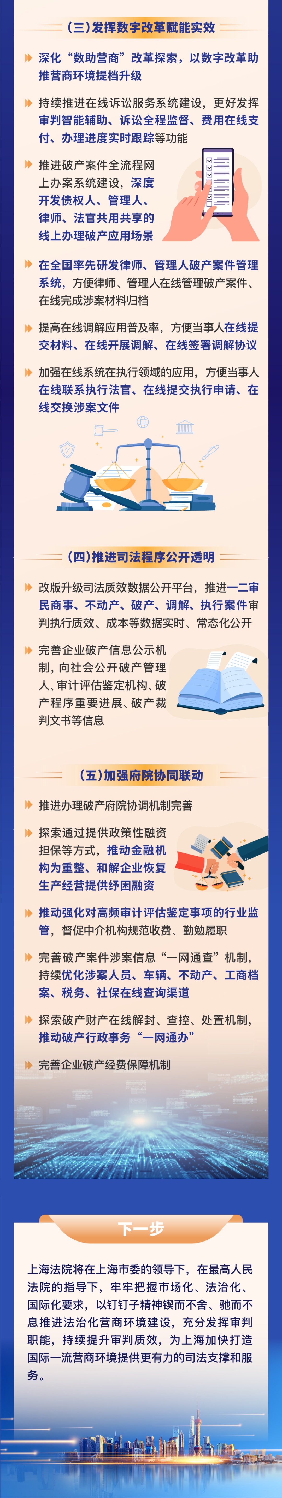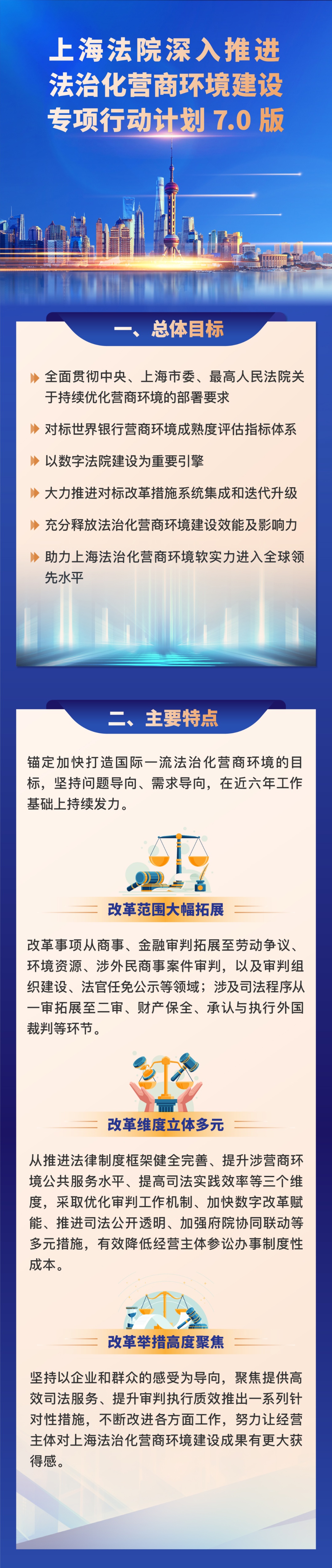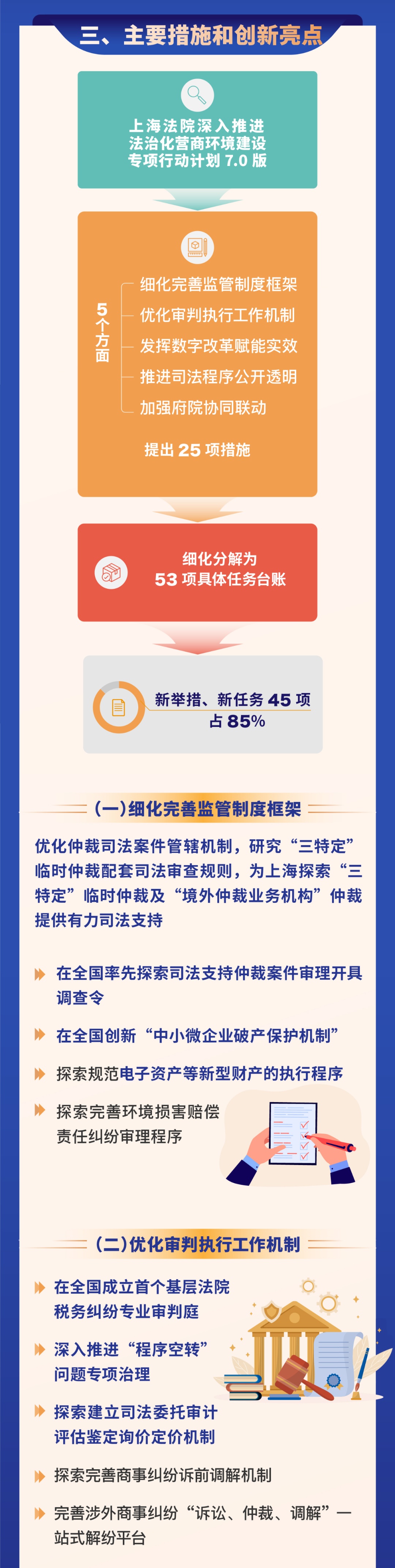 市高院近日印發(fā)《上海法院深入推進(jìn)法治化營(yíng)商環(huán)境建設(shè)專(zhuān)項(xiàng)行動(dòng)計(jì)劃(7.0版)》(以下簡(jiǎn)稱上海法院7.0版),標(biāo)志著上海法院法治化營(yíng)商環(huán)境建設(shè)新一輪工作正式啟動(dòng)。新舉措、新任務(wù)45項(xiàng),占85%。包括細(xì)化完善監(jiān)管制度框架、優(yōu)化審判執(zhí)行工作機(jī)制、發(fā)揮數(shù)字改革賦能實(shí)效、推進(jìn)司法程序公開(kāi)透明、加強(qiáng)府院協(xié)同聯(lián)動(dòng)等5方面。圖解詳見(jiàn)↓