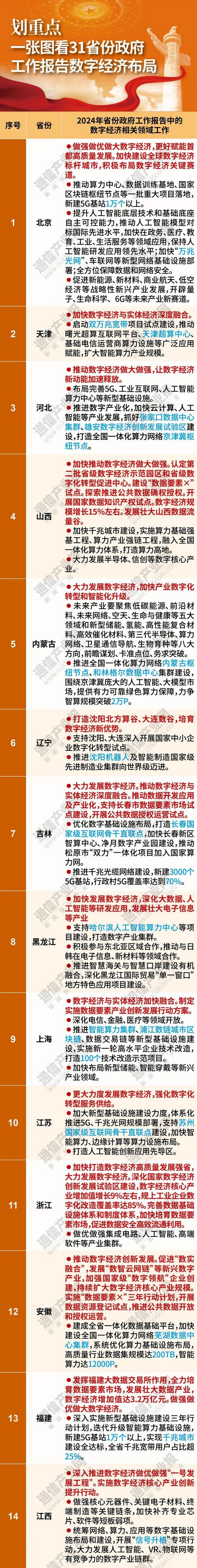 近日,各地新春召開第一會,而此前春節(jié)前夕,全國31個省、自治區(qū)、直轄市陸續(xù)勝利閉幕了地方省級人代會,通過了地方政府工作報告,為各地工作做出具體行動擘畫。在高質量發(fā)展主基調(diào)下,31省、自治區(qū)、直轄市政府工作報告,都對新一年數(shù)字經(jīng)濟發(fā)展做出扎實安排,特別是對新型數(shù)字基礎設建設、數(shù)據(jù)要素資源管理和市場開發(fā)、參與全國一體化算力網(wǎng)建設、數(shù)字技術與實體經(jīng)濟融合、數(shù)字經(jīng)濟產(chǎn)業(yè)集群打造、數(shù)字化創(chuàng)新的試點示范等做出具體規(guī)劃,很多省市區(qū)有指標、有路徑。地方政府的數(shù)字經(jīng)濟發(fā)展的具體安排,正在拉開數(shù)字經(jīng)濟發(fā)展的最一線生動畫卷。