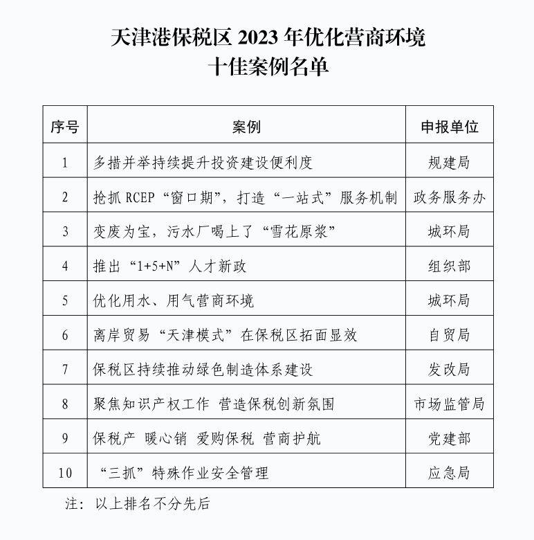 2023年天津港保稅區(qū)堅持深入貫徹黨中央、國務(wù)院關(guān)于優(yōu)化營商環(huán)境工作的重要部署,落實市委市政府“十項行動”工作要求、濱海新區(qū)高質(zhì)量發(fā)展支撐引領(lǐng)行動方案,對標(biāo)國際高標(biāo)準(zhǔn)經(jīng)貿(mào)規(guī)則,進一步激發(fā)市場活力,加快打造市場化、法治化、國際化的營商環(huán)境高地,充分釋放營商環(huán)境改革的“生產(chǎn)力效應(yīng)”。