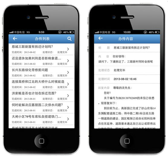 通過移動終端可以實時查看辦件列表,關(guān)注自己提交的辦件或是他人提交辦件處理的情況。充分知情政民交互的內(nèi)容,可以方便地瀏覽熱點處理信息和常見問題信息。