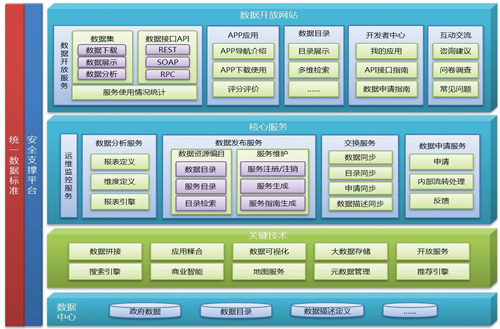 其中,數(shù)據(jù)中心統(tǒng)一存放要對外發(fā)布的政府?dāng)?shù)據(jù),包括政府?dāng)?shù)據(jù)、數(shù)據(jù)目錄和數(shù)據(jù)描述定義;核心服務(wù)是對數(shù)據(jù)開放網(wǎng)站提供的支撐服務(wù),包括數(shù)據(jù)申請服務(wù)、交換服務(wù)、數(shù)據(jù)發(fā)布服務(wù)、數(shù)據(jù)分析服務(wù)和運(yùn)維監(jiān)控服務(wù);數(shù)據(jù)開放網(wǎng)站是數(shù)據(jù)開放服務(wù)的載體,是面向社會的窗口,主要包括數(shù)據(jù)開放服務(wù)、APP應(yīng)用、數(shù)據(jù)目錄、開發(fā)者中心和互動交流版塊。