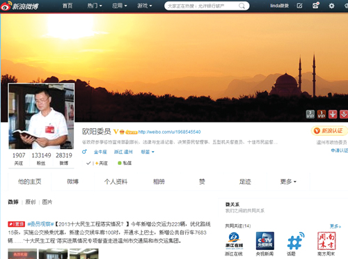 在網(wǎng)絡(luò)上找到歐陽后增并不難,只要在搜索頁面輸入“歐陽委員”,便會出現(xiàn)一系列網(wǎng)頁鏈接,首先進入眼簾的就是新浪微博。進入他的新浪微博主頁,記者被他的簡介所吸引:省政府參事咨詢協(xié)會宣傳部副部長、溫州市政協(xié)委員、社情民意信息員、五型機關(guān)督查員、十佳市民監(jiān)督員、媒體特約評論員……人稱“提案大王”。身居多職、擁有十幾萬粉絲的他,跟記者分享了他對微博問政的一些看法。