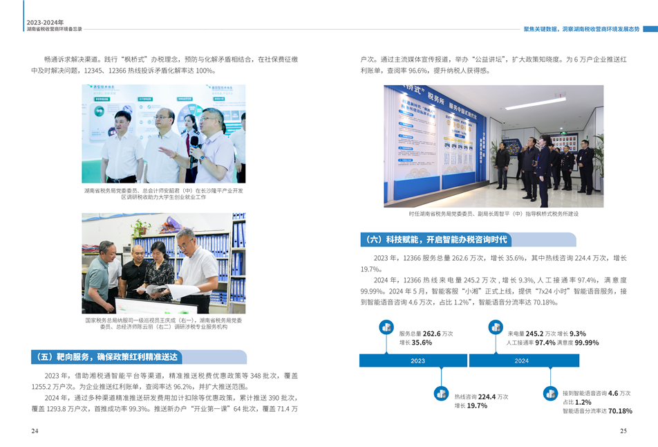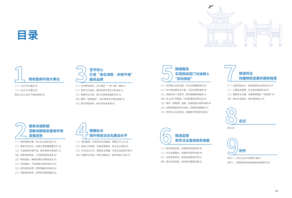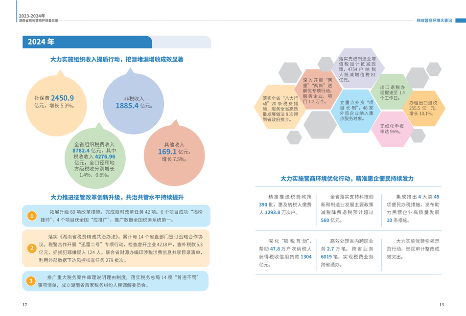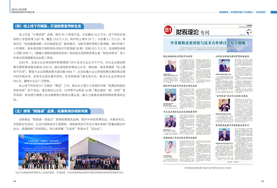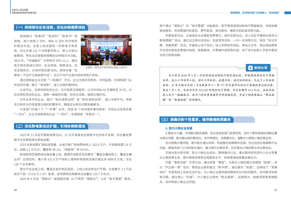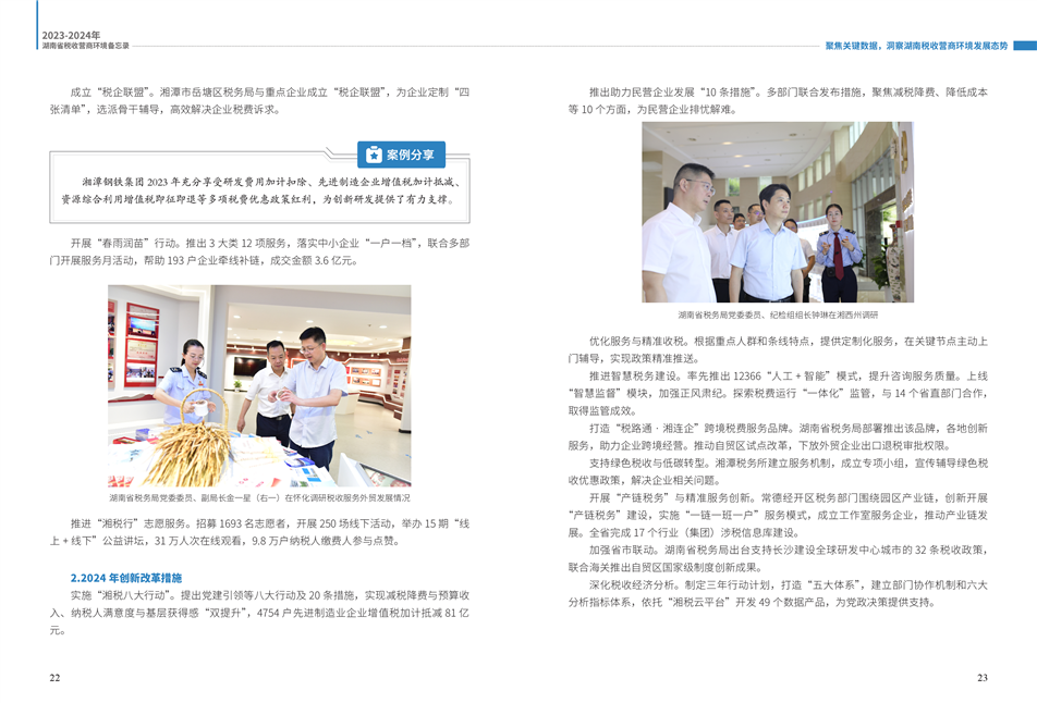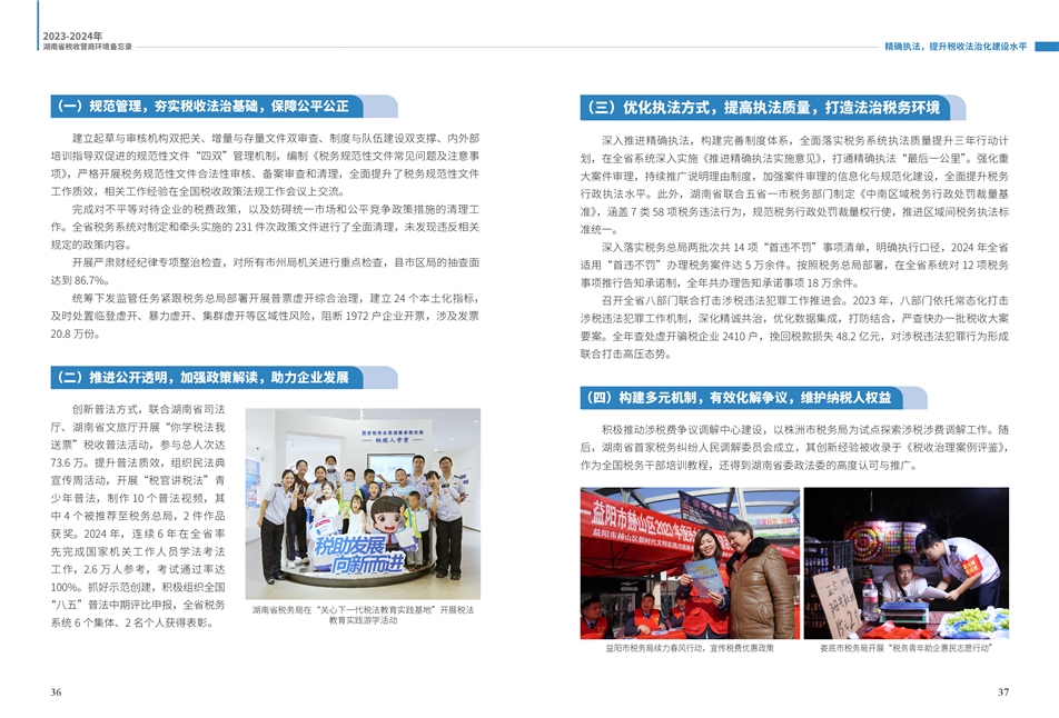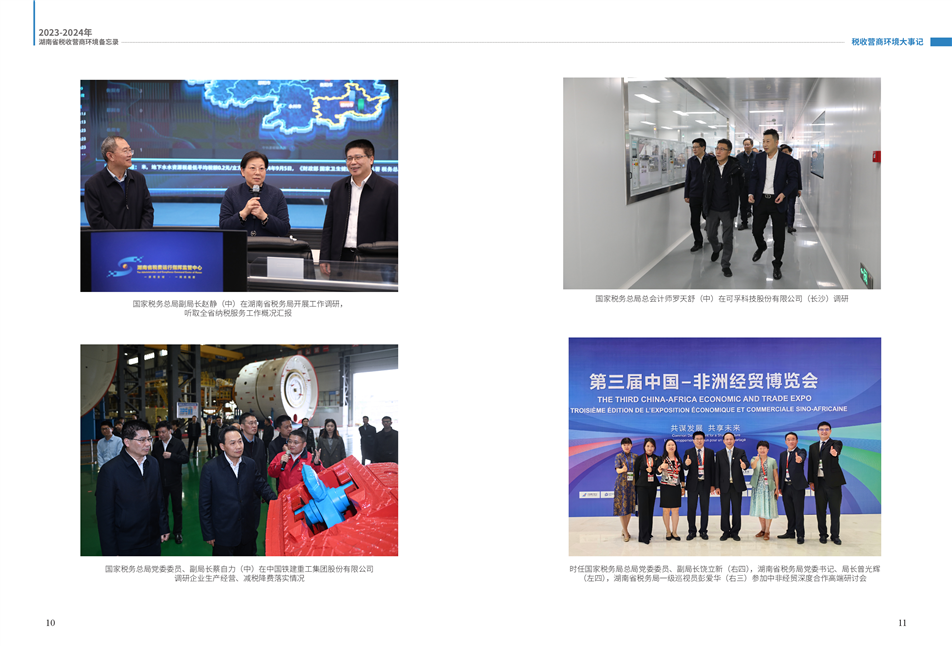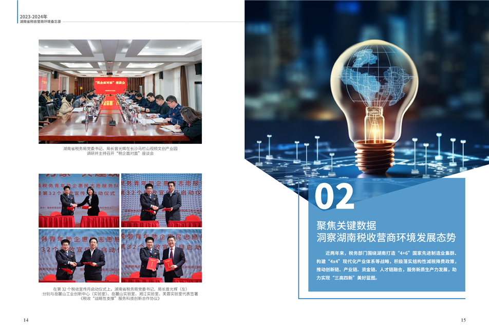為更好展示湖南稅務部門在優(yōu)化營商環(huán)境工作中的創(chuàng)新舉措和改革成效,湖南省稅務局組織編寫了《2023—2024年湖南省稅收營商環(huán)境備忘錄》。全書共分為9個篇章,以“四個聚焦”鋪展呈現(xiàn):