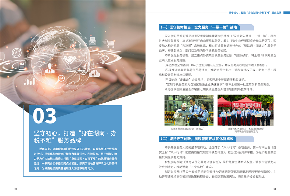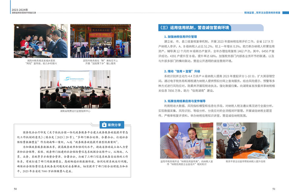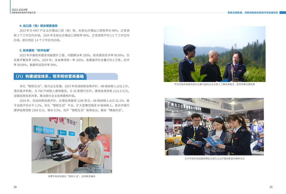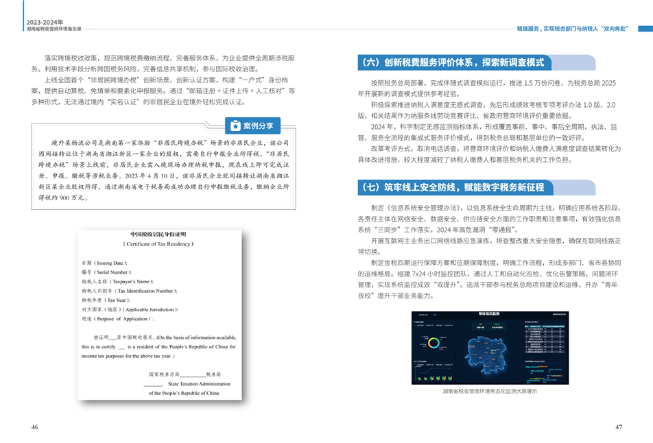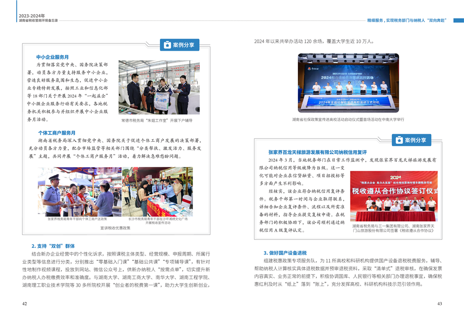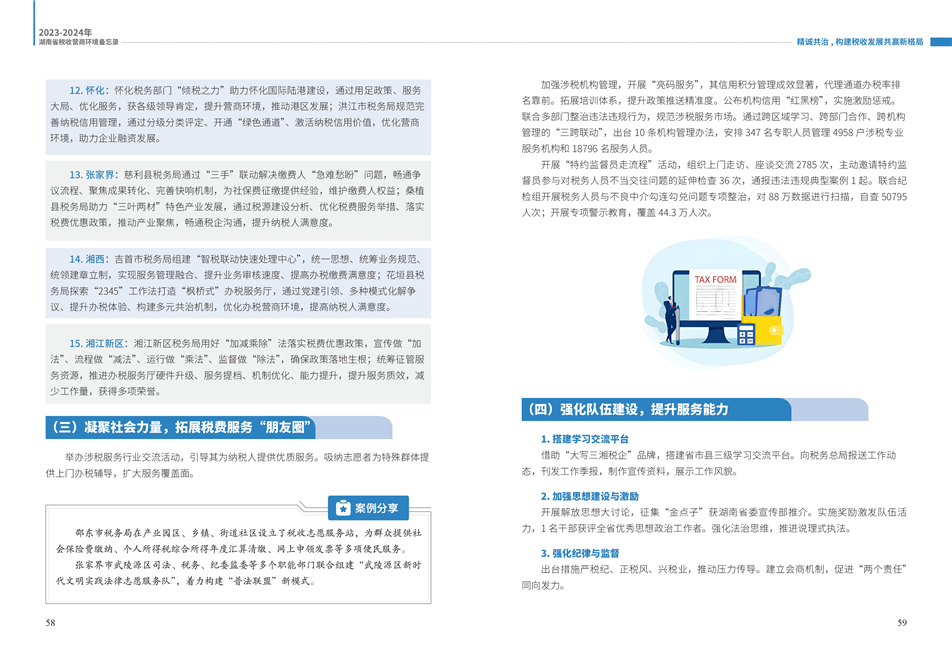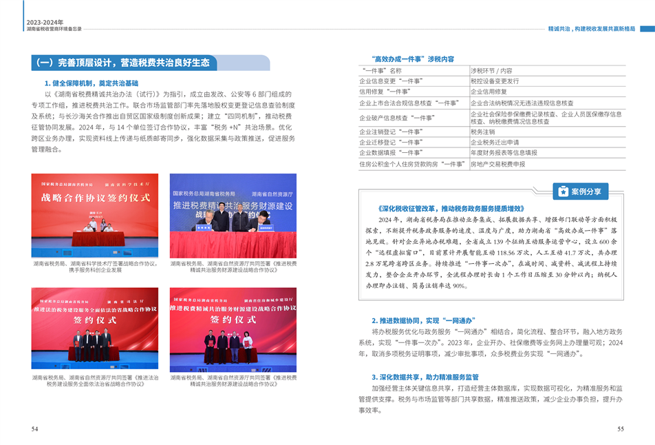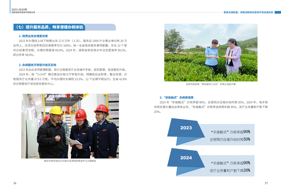 為更好展示湖南稅務部門在優(yōu)化營商環(huán)境工作中的創(chuàng)新舉措和改革成效,湖南省稅務局組織編寫了《2023—2024年湖南省稅收營商環(huán)境備忘錄》。全書共分為9個篇章,以“四個聚焦”鋪展呈現(xiàn):