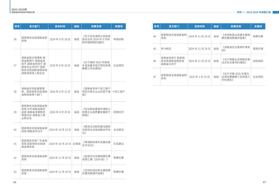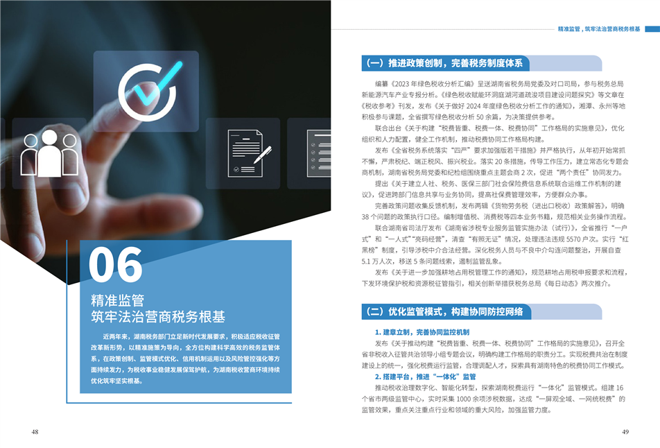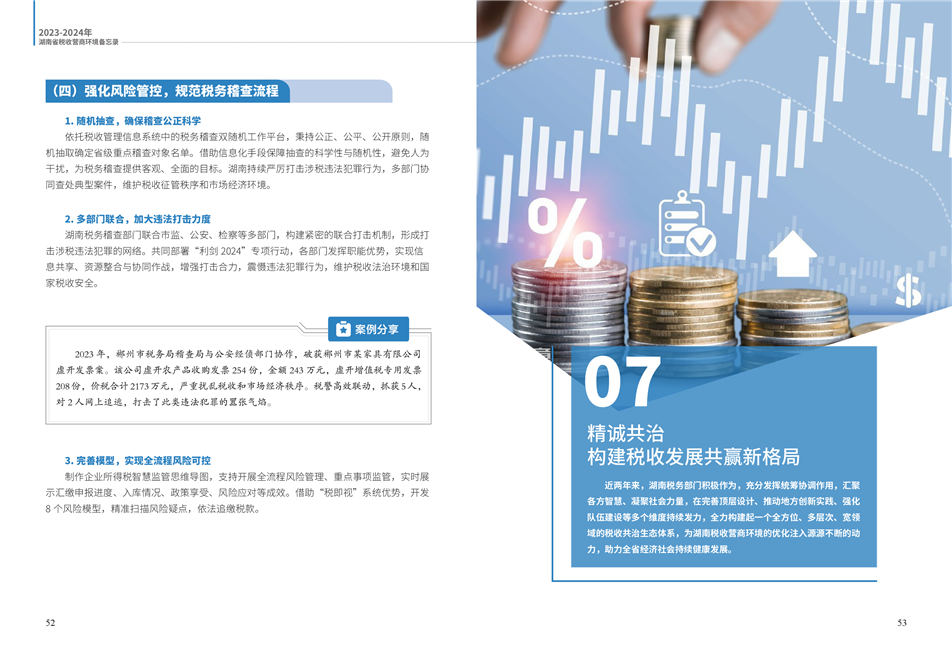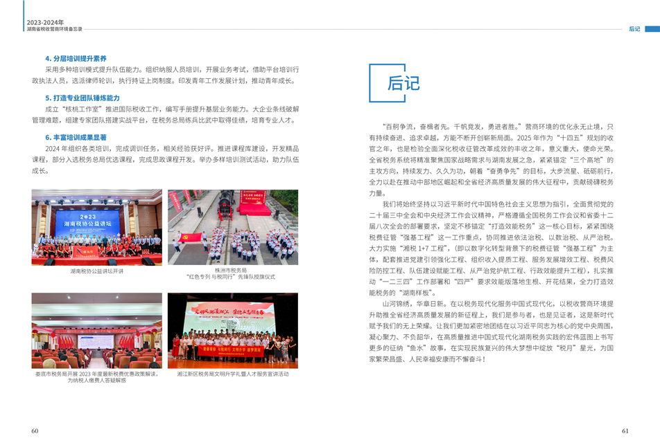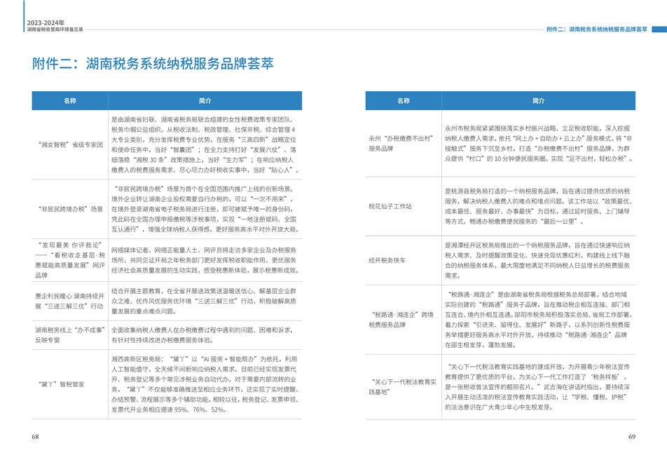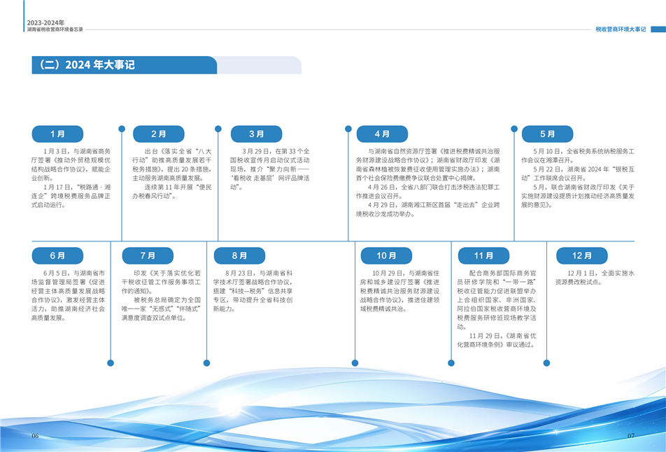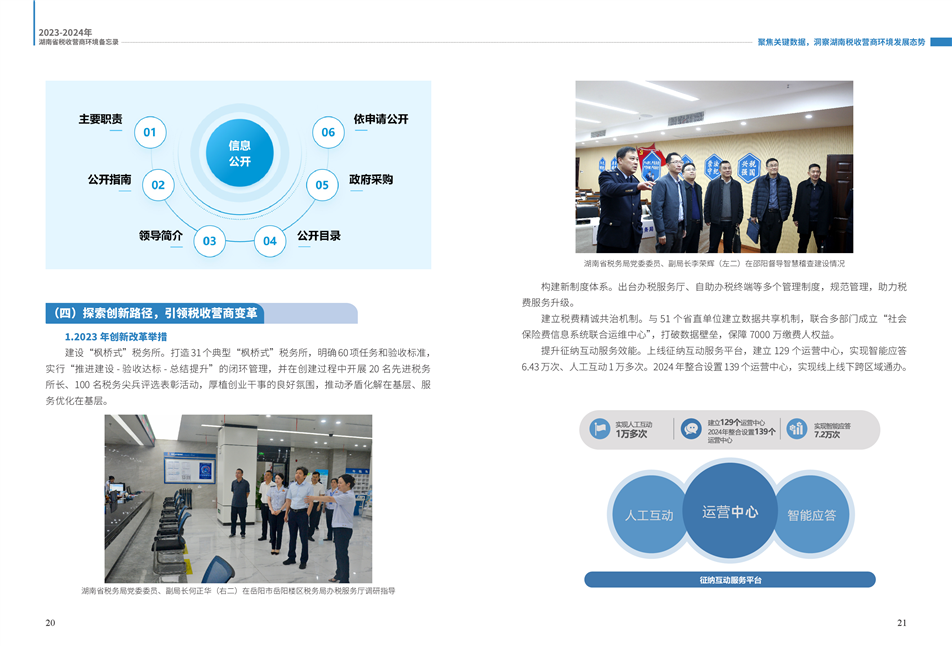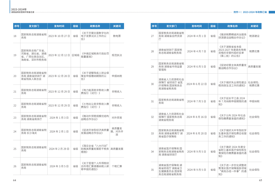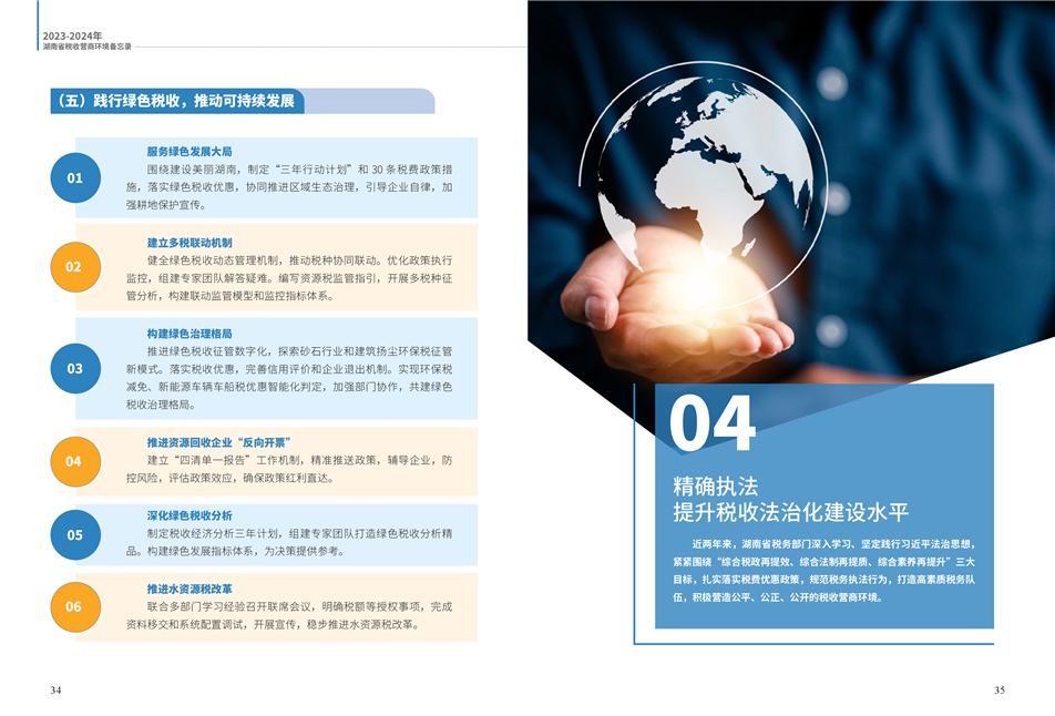 為更好展示湖南稅務部門在優(yōu)化營商環(huán)境工作中的創(chuàng)新舉措和改革成效,湖南省稅務局組織編寫了《2023—2024年湖南省稅收營商環(huán)境備忘錄》。全書共分為9個篇章,以“四個聚焦”鋪展呈現(xiàn):