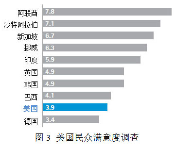在“民眾滿意度調查”中發(fā)現(xiàn),盡管美國政府在數(shù)字技術上投入很大,但美國民眾對政府公共服務的滿意度很低,對未來是否能滿足需求和期望的信心也不足(圖3)。另外,很多人不愿意利用新技術(如移動和云計算)與政府互動以及現(xiàn)有數(shù)字政府服務的低利用率等都拉低了美國民眾的滿意度。
