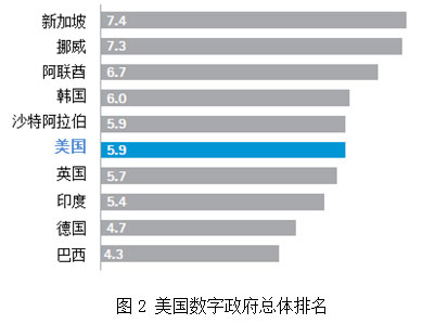 美國的數(shù)字政府業(yè)績在十個國家中名列第六,得分是5.9分(圖2)。