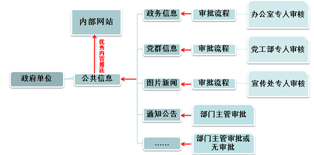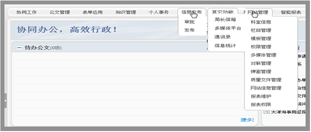 (1)內(nèi)部網(wǎng)站一體化集成:內(nèi)部網(wǎng)站管理功能均以菜單的方式集成在協(xié)同平臺,實現(xiàn)了信息審批及信息推送位置的自動性