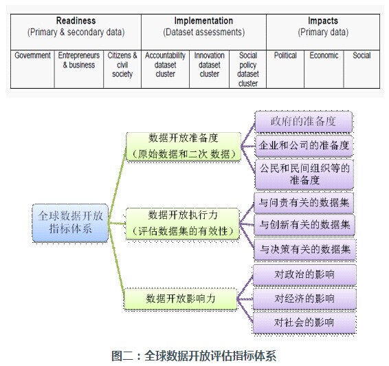 為了更好地對全球數(shù)據(jù)開放情況進行評估,《報告》主要從準備度、執(zhí)行力和影響力三個維度對各國所處開放數(shù)據(jù)的階段及其在給經(jīng)濟、政治和社會所帶來的影響進行了評估。其中,準備度是指一個國家是否具備實現(xiàn)開放數(shù)據(jù)潛力的政策、社會和經(jīng)濟基礎(chǔ),包括政府、企業(yè)、公眾與民間團體三方面;執(zhí)行力是指政府發(fā)布一系列關(guān)鍵數(shù)據(jù)集以支持社會各界進行創(chuàng)新、對政府的審計問責和改進有關(guān)決策的程度;影響力是指開放數(shù)據(jù)已導(dǎo)致積極的政策、社會、環(huán)境和經(jīng)濟變化的程度。