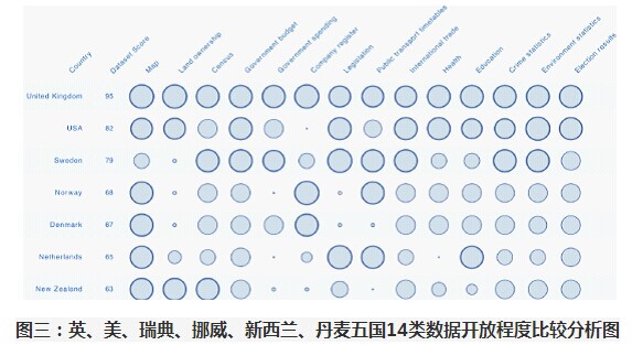 這里重點選取排名前五的國家和中國進行了比較分析,分析結(jié)果顯示:英國政府14類數(shù)據(jù)開放綜合程度最高;美國的公司注冊數(shù)據(jù)公開度極低;瑞典在土地持有數(shù)據(jù)上公開力不足;挪威在土地持有、政府財政支出和法律方面數(shù)據(jù)公開力不足;丹麥在土地持有、法律和公共交通方面數(shù)據(jù)公開力不足;新西蘭則在政府財政支出、法律、健康方面數(shù)據(jù)公開力不足;與上述國家相比,中國的14類數(shù)據(jù)公開力都極低。