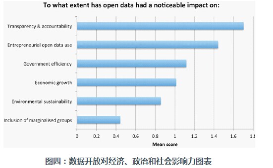 在影響力方面,開放數(shù)據(jù)在提升政府透明度和問責意識方面所帶來的影響影響是巨大的,較美國、英國都高,充分表白政府數(shù)據(jù)開放是有其積極推動作用的。新西蘭政府已經(jīng)開始投入相當大的努力對政府開放透明度和數(shù)據(jù)開放程度進行監(jiān)測,政府機構(gòu)被要求就該數(shù)據(jù)再利用進展情況、案例應(yīng)用定期向首相提供報告,并且對開放和透明政府宣言的應(yīng)用情況提供年度進展情況報告。