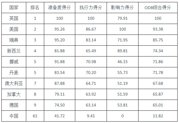 從《報告》排名和得分情況來看,中國位列第61位,綜合得分為11.82,整體排名較為靠后。從指標具體情況來看,在三個維度中,中國的準備度得分最高,但也僅為41.72,與美國、英國等先進國家相比差距較大,表明我國政府公共數(shù)據(jù)開放在政策推動、公民意識等準備方面上較為不足;執(zhí)行力得分僅為9.41,表明我國數(shù)據(jù)開放在推動創(chuàng)新、提升政府透明度和改善社會決策等方面能力明顯不足,數(shù)據(jù)有效性和價值度、易用性不高,例如我國政府支出數(shù)據(jù)只有十分粗略的總數(shù),幾乎不具備可用價值,而選舉數(shù)據(jù)則完全缺失;影響力得分為0,表明我國政府數(shù)據(jù)的應(yīng)用潛力未得到有效挖掘,未來有較大的開發(fā)空間。