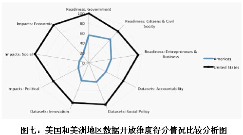 如圖所示,藍色曲線表示美洲地區(qū)數(shù)據(jù)開放水平,黑色曲線表示美國政府數(shù)據(jù)開放水平,從圖中可以看出,美國數(shù)據(jù)開放程度遠遠超出美洲地區(qū)平均水平。2009年美國政府作為“第一個吃螃蟹”的國家發(fā)布了政府數(shù)據(jù)開放倡議,要求政府部門發(fā)布機器可讀的、標準化的、高價值的數(shù)據(jù),強調(diào)數(shù)據(jù)可能帶來的經(jīng)濟價值。2013年5月美國政府再次發(fā)力,發(fā)布了要求更高的“Open Data Policy”行政命令,要求公開教育、健康、財政、農(nóng)業(yè)等七大關(guān)鍵領(lǐng)域數(shù)據(jù),并對各政府機構(gòu)數(shù)據(jù)開放時間做出了明確要求,同時推出“Project Open Data”項目,向社會開放更多政府API,讓開發(fā)者可以各方便地利用政府數(shù)據(jù)創(chuàng)造潛在經(jīng)濟價值。
