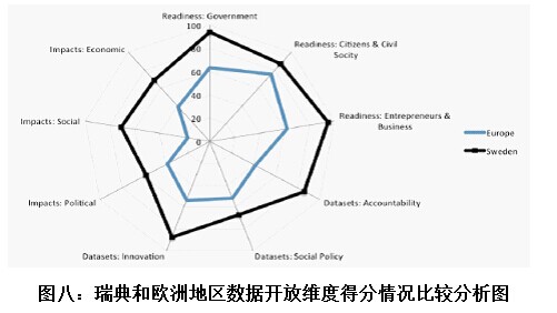 如圖所示,藍色曲線表示歐洲政府數(shù)據(jù)開放水平,黑色曲線表示瑞典政府數(shù)據(jù)開放水平,從圖中可以看出,瑞典在數(shù)據(jù)開放的得分高于歐洲平均水平。得益于瑞典政府對數(shù)據(jù)開放的重視,瑞典在政府數(shù)據(jù)開放準備方面得分較高。瑞典早在1776年就成為世界第一個形成信息權(quán)利法《Right to Information law》的國家,這為瑞典2012年發(fā)布政府數(shù)據(jù)開放統(tǒng)一門戶網(wǎng)站http://?ppnadata.se/奠定良好的基礎(chǔ)。