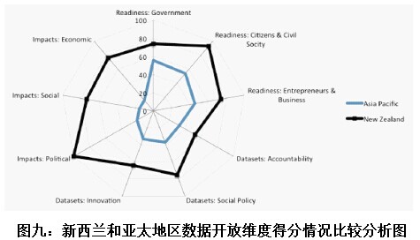 如圖所示,藍色曲線表示亞太地區(qū)政府數(shù)據(jù)開放水平,黑色曲線表示新西蘭政府數(shù)據(jù)開放水平,從圖中可以看出,新西蘭在數(shù)據(jù)開放的得分明顯高于亞太地區(qū)平均水平。早在2008年起,新西蘭政府加快了政府數(shù)據(jù)開放的腳步,成立了專門的推動機構(gòu),制定并出臺了一系列文件和措施,建立了專門的數(shù)據(jù)開放統(tǒng)一門戶網(wǎng)站,希望通過公共數(shù)據(jù)的開放,增強政府透明度,推動企業(yè)創(chuàng)新更多利潤,激發(fā)社會公眾的創(chuàng)造力。