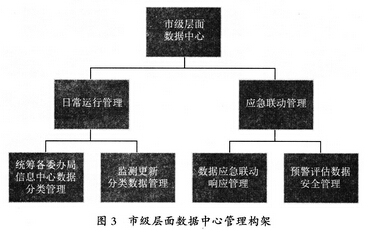 市級(jí)層面數(shù)據(jù)中心管理構(gòu)架(如圖3),主要分為日常運(yùn)行管理及應(yīng)急聯(lián)動(dòng)管理兩類,制定統(tǒng)一數(shù)據(jù)信息安全管理標(biāo)準(zhǔn)、信息數(shù)據(jù)標(biāo)準(zhǔn)化格式。同時(shí)明確數(shù)據(jù)使用、數(shù)據(jù)安全、數(shù)據(jù)發(fā)布、相關(guān)者的權(quán)力、法律保護(hù)、監(jiān)管機(jī)構(gòu)、對(duì)數(shù)據(jù)的特殊使用、特殊使用的種類、處罰規(guī)定、過渡和最終規(guī)定等。