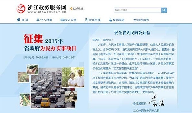 與前一封信略有不同的是,李強(qiáng)的公開信借助的是“浙江政務(wù)服務(wù)網(wǎng)”這一平臺(tái)。此舉既體現(xiàn)浙江決策層一貫以來希望利用互聯(lián)網(wǎng)更廣泛收集民意的期望,折射出通過網(wǎng)絡(luò)問政于民、問需于民、問計(jì)于民的誠心,以更加開放的方式和開明的態(tài)度對(duì)待網(wǎng)民意見,為履職盡責(zé)凝聚最廣泛的力量,同時(shí)也進(jìn)一步推廣了“政務(wù)服務(wù)網(wǎng)”這一浙江首創(chuàng)的深化改革“具象”。