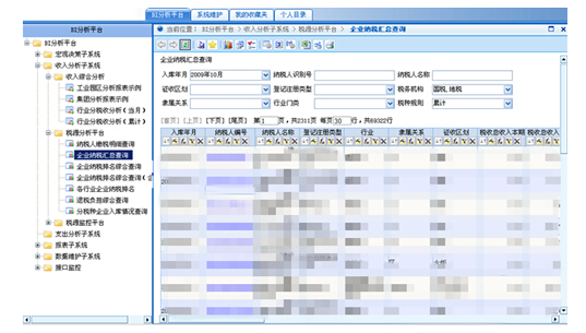 通過財稅庫銀橫向聯(lián)網(wǎng)系統(tǒng)(TIPS2.0)的數(shù)據(jù)和稅務(wù)登記信息的結(jié)合,以及用戶定義企業(yè)屬性(工業(yè)園區(qū)、企業(yè)集團等),滿足對財稅收入以及重點稅源的分析需求,提供對稅收的多角度分析,為各層管理人員提供統(tǒng)計和分析數(shù)據(jù),協(xié)助其及時發(fā)現(xiàn)問題并快速響應(yīng)。