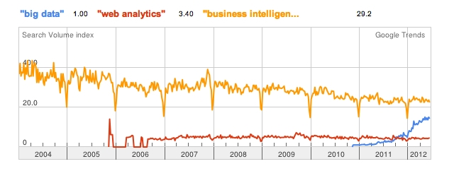 如下圖所示,谷歌趨勢顯示,與“網(wǎng)站分析”(web analytics)和”商業(yè)智能”(business intelligence)較為平穩(wěn)的搜索曲線相比,“大數(shù)據(jù)”(big data)的搜索量迎來了火箭式的大幅度增長。