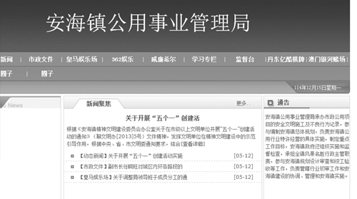 記者點(diǎn)開鏈接,乍一看,像是個(gè)正規(guī)網(wǎng)站,仔細(xì)一瞧,發(fā)現(xiàn)這個(gè)頁面無論是網(wǎng)站結(jié)構(gòu)還是美工程度都比較粗糙。頁面正上方有著大大的“安海鎮(zhèn)公用事業(yè)管理局”幾個(gè)字,下面一欄導(dǎo)航中有十個(gè)小欄目,其中包括“動(dòng)態(tài)新聞”、“市政文件”等,令人咋舌的是,竟然還有“皇馬娛樂場”、“丹東億酷棋牌”、“澳門銀河賭場”等欄目。記者試著打開“皇馬娛樂場”欄目,跳出的是一個(gè)充滿各種賭場廣告和賭博信息的網(wǎng)站。