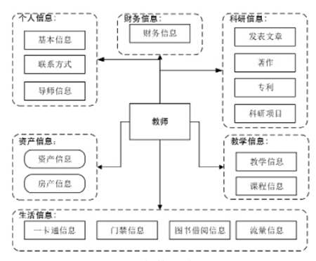 在方案設(shè)計(jì)中,個人數(shù)據(jù)中心按照用戶角色分為教師數(shù)據(jù)中心和學(xué)生數(shù)據(jù)中心。教師數(shù)據(jù)中心包括個人基本信息、科研信息、資產(chǎn)信息、教學(xué)信息、生活信息等,如圖3所示。