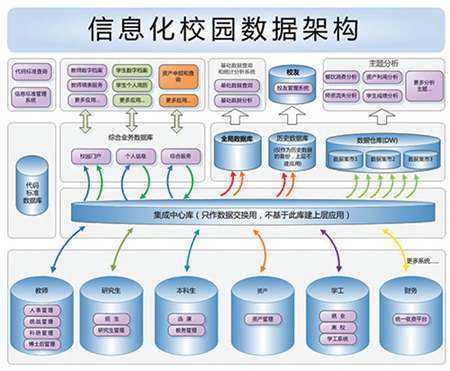 數(shù)據(jù)集成的作用是為整個“一站式”服務(wù)框架建立基礎(chǔ)的、權(quán)威的數(shù)據(jù)源。數(shù)據(jù)集成依托信息化校園數(shù)據(jù)中心,采用數(shù)據(jù)交換工具,將運(yùn)行過程中逐步積累的數(shù)據(jù)整合、抽取和同步置入綜合服務(wù)數(shù)據(jù)庫,并通過數(shù)據(jù)篩選、轉(zhuǎn)換,將來源于業(yè)務(wù)系統(tǒng)的數(shù)據(jù)按業(yè)務(wù)流程或職能分工組織改變?yōu)橐匀?、?cái)、物等主題組織,形成完整、獨(dú)立的主題數(shù)據(jù)庫,讓師生能夠方便地使用與自己相關(guān)的個人綜合業(yè)務(wù),讓院系能夠方便地查詢自己部門的人事、教學(xué)、科研等綜合情況,并為跨部門業(yè)務(wù)提供數(shù)據(jù)封裝和應(yīng)用接口。