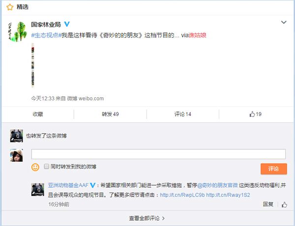 2月25日,國家林業(yè)局官方微博轉(zhuǎn)載了@譙姑娘的博文。國家林業(yè)局新聞處的一名工作人員向澎湃新聞證實(shí),這體現(xiàn)了國家林業(yè)局對該文的認(rèn)可,轉(zhuǎn)載是為網(wǎng)友的觀點(diǎn)“點(diǎn)贊”,但并不意味著馬上會(huì)對節(jié)目采取措施,國家林業(yè)局會(huì)一直關(guān)注這一事件。