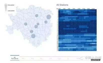 可視化的例子。2013年12月,米蘭的幾個主要污染物的強(qiáng)度分布圖——熱圖,其中包含在矩陣中的數(shù)值被表示為顏色數(shù)據(jù)的圖形;徑向堆疊面積圖以24小時為一圈進(jìn)行編碼,分析了每小時各污染物的累計濃度。