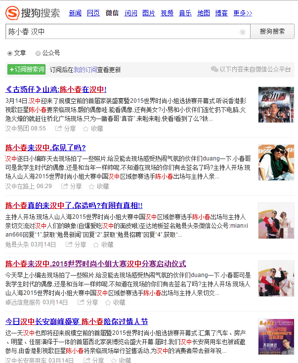經(jīng)過“陜西新媒體”的平臺監(jiān)控,我們發(fā)現(xiàn)3月14日有個地區(qū)性新聞在微信公眾號和微信朋友圈里面?zhèn)鞑V泛。內(nèi)容就是“陳小春來漢中,你見了嗎?”,下面是漢中各公號的內(nèi)容列表: