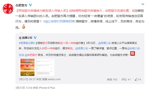 近日,@湘潭公安(湖南湘潭市公安局官方微博)、@安徽公安在線(安徽省公安廳官方微博)、@合肥警方(安徽合肥市公安局官方微博)通過密切配合,一天內(nèi)就破獲一個(gè)涉嫌傳銷的組織,成功解救了誤入傳銷組織的湘潭人吳某某。這也是湘潭警方利用新媒體平臺(tái)與線下聯(lián)動(dòng)破案的又一成功案例。