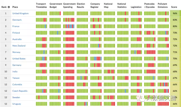 開放數(shù)據(jù)指數(shù)通過評估各國10個(gè)關(guān)鍵數(shù)據(jù)集,例如政府項(xiàng)目級支出數(shù)據(jù)、國家公共交通時(shí)刻表、環(huán)境污染指數(shù)等的可獲取性和可訪問性來進(jìn)行國家級開放數(shù)據(jù)項(xiàng)目績效排序。 2014年,英國再摘開放數(shù)據(jù)指數(shù)的桂冠,總體開放性達(dá)到了96%,而緊隨其后的則是丹麥以及去年排名才12位而今年已到第3位的法國。第4位的是芬蘭,而第5位則由澳大利亞和新西蘭共享。今年的指數(shù)結(jié)果里最令人振奮的有去年排名27而今年進(jìn)步到第10位的印度,以及共同占據(jù)第12位的拉丁美洲的哥倫比亞和烏拉圭。 塞拉利昂,馬里共和國,海地以及幾內(nèi)亞在今年的開放數(shù)據(jù)指數(shù)中墊底,但需要指出的,還有更多比這些政府在數(shù)據(jù)開放性上更糟糕的,這里沒有包含他們主要是因?yàn)闆]有足夠的公開數(shù)據(jù)以供評估以及當(dāng)?shù)貨]有足夠的志愿者來完成相應(yīng)的評估。 整體而言,雖然開放的關(guān)鍵數(shù)據(jù)集整體數(shù)量有所上升(從87到104),但開放數(shù)據(jù)集占整體的比例仍舊很低,僅為11%。 即使對于那些在開放數(shù)據(jù)項(xiàng)目上的領(lǐng)頭國家,也有大量的提升空間:比如對于美國和德國,他們就沒有提供整合的、開放的企業(yè)注冊數(shù)據(jù)庫。而政府項(xiàng)目級支出的數(shù)據(jù)開放性也讓人大失所望,大多數(shù)國家要么完全沒有提供此類信息,又或者僅提供了有限的信息。在97個(gè)國家中,僅有英國和希臘兩個(gè)國家提供了完全開放的政府項(xiàng)目級支出數(shù)據(jù)。在目前各國經(jīng)濟(jì)增長仍舊緩慢甚至艱巨的時(shí)期,提供市民和企業(yè)免費(fèi)開放的數(shù)據(jù)意味著我們能夠更高效的開源節(jié)流,以及提高政府效能。 Pollock 說道: