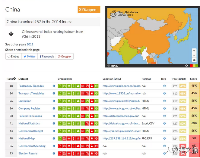 對于中國而言,中央政府至今還未推出相應(yīng)的開放數(shù)據(jù)政策,而與開放數(shù)據(jù)相關(guān)聯(lián)的數(shù)據(jù)所有權(quán)界定、數(shù)據(jù)授權(quán)、個(gè)人隱私保護(hù)法等議題也都尚在討論中。較之2013年,中國在10個(gè)關(guān)鍵數(shù)據(jù)集的開放上并未有進(jìn)步,也因此當(dāng)大量新國家加入開放數(shù)據(jù)指數(shù),以及若干國家有了大幅進(jìn)步以后,中國的排名從2013年的36名下滑至了57名。