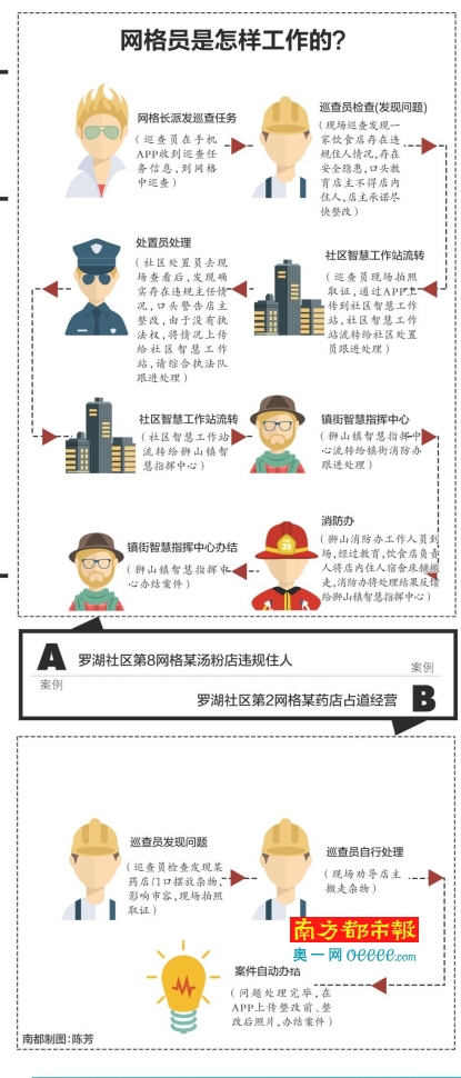 “以前檢查一個(gè)工廠,今天安監(jiān)去,明天消防去,后天城管去,對(duì)企業(yè)干擾多次,現(xiàn)在一個(gè)巡查員去一次就搞掂了。”羅湖社區(qū)黨委副書記、社區(qū)服務(wù)中心主任吳其國(guó)介紹,實(shí)施網(wǎng)格化之后,該社區(qū)40多名工作人員進(jìn)行重新整合,成為網(wǎng)格里的巡查員、處置員、坐席員,并無(wú)增員。