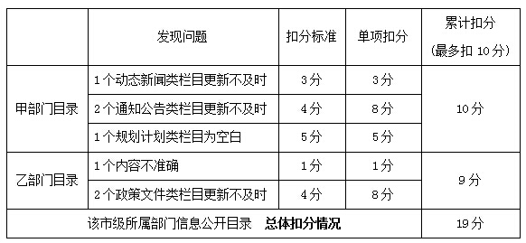 例如:某市政府門戶網(wǎng)站市級(jí)所屬部門信息公開目錄中,有2個(gè)部門目錄存在問(wèn)題,具體問(wèn)題類型、數(shù)量和扣分計(jì)算過(guò)程如下。該市所屬部門信息公開目錄總體扣19分。