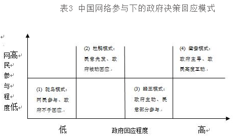 總之,鴛鴦模式為未來制度化、常態(tài)化的有效政府決策和有序規(guī)范的網(wǎng)絡(luò)參與提供了有益的理論依據(jù)。在網(wǎng)絡(luò)參與環(huán)境下,要改進政府決策回應(yīng)力,化解網(wǎng)絡(luò)政治風(fēng)險,引導(dǎo)規(guī)范、有序的網(wǎng)絡(luò)參與,其思路和對策可以從以下方面來考慮:第一、改進信息發(fā)布制度,樹立政府信息源權(quán)威。這是從網(wǎng)絡(luò)參與的權(quán)力和信息機制出發(fā)的。第二、建立開放性的政策制定網(wǎng)絡(luò)系統(tǒng),建設(shè)參與回應(yīng)型政府,整合成為整體型政府(Holistic Government)。[37]這是從公共決策的目的出發(fā)的。第三、改革政府決策機制,提高政治參與的成本收益率。這是從防止無序網(wǎng)絡(luò)參與發(fā)生出發(fā)的。第四、完善網(wǎng)絡(luò)立法,規(guī)范網(wǎng)絡(luò)參與秩序。這是從規(guī)范網(wǎng)絡(luò)參與程序出發(fā)的。