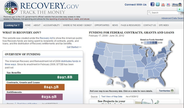 2009年,金融危機之時,美國也在救市,通過Recovery.gov上的地圖,人們可以看到各地公共財政資金的流向,點進去可以看到每筆政府資金的地點、數(shù)目、簽約方,以及錢是怎么花掉的。從整個美國地圖看,投入最多的是加州和紐約州。這些也屬于信息公開。