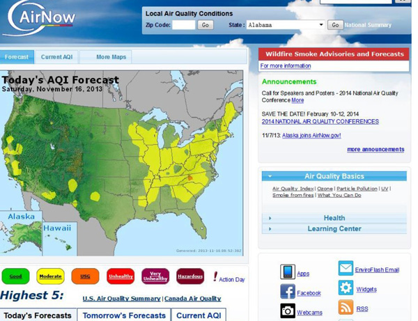 環(huán)保領域有個項目叫“AirNow”。從這個網(wǎng)站,人們可以看到全美的空氣質(zhì)量。圖例從綠色、黃色到紅色代表從優(yōu)到差。點進去可以看到紐約州,進一步點擊,可看到某一區(qū)域、某市的空氣質(zhì)量。