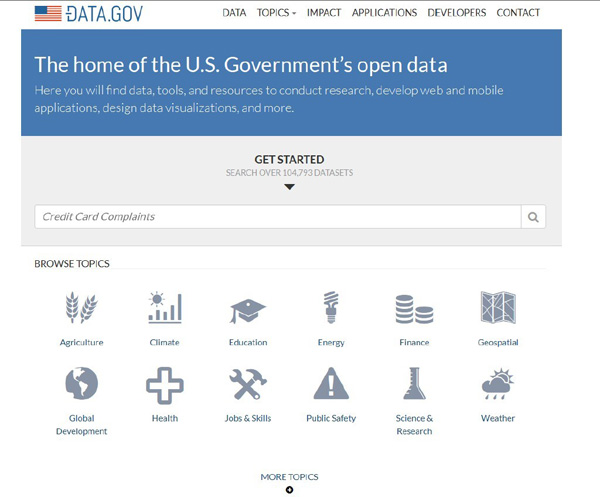 目前,美國聯(lián)邦政府已在此平臺開放了來自多個領域的13萬個數(shù)據(jù)集。這些領域包括農(nóng)業(yè)、商業(yè)、氣候、生態(tài)、教育、能源、金融、衛(wèi)生、科研等十多個主題。