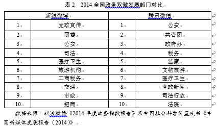 2014年政務(wù)“雙微”在部門系統(tǒng)分布對(duì)比相對(duì)來說呈現(xiàn)出縱向?qū)Ρ炔痪?,橫向?qū)Ρ认鄬?duì)較均衡的態(tài)勢(shì),如表2所示。在《2014政務(wù)新媒體傳播力報(bào)告》里,排名前三的黨政宣傳、團(tuán)委、公安分別以29099家、19052家和17025家各自占據(jù)所有部門微博總數(shù)94164家的30.9%、20.2%和18.1%,三個(gè)系統(tǒng)的政務(wù)微博占據(jù)了所有政府系統(tǒng)的一半以上比例,可見,政務(wù)微博發(fā)展縱向?qū)Ρ葮O其不均衡。而政務(wù)微信發(fā)展排行前三的依次為公安1635個(gè)、旅游 1004個(gè)、司法813個(gè),分別占據(jù)全國(guó)政務(wù)微信總數(shù)16446家的9.9%、6.1%、4.9%,雖然在總比例上不及地域分布那么不均衡,但是因?yàn)檎?wù)微信的部門系統(tǒng)分布的比較細(xì),因此,縱向?qū)Ρ茸陨硪廊粚儆诓痪獍l(fā)展?fàn)顟B(tài)。值得關(guān)注的是,公安、司法、稅務(wù)、醫(yī)療衛(wèi)生以及文化旅游五個(gè)常常處于社會(huì)利益沖突最前端的部門成為政務(wù)“雙微”最熱部門,也是亟待開展“指尖上的對(duì)話”部門。